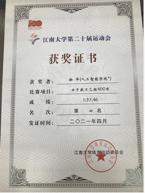 女中豪杰徐华老师分别在100米和400米赛场上一展英姿,获得了第四名的好成绩。