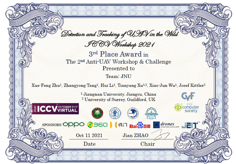 教授吴小俊和英国萨里大学电子工程系教授Josef Kittler带领的模式识别与计算智能国际联合实验室(IJLPRCI)与清华大学自动化系鲁继文教授合作,荣获了多模态视频推理分析比赛(Multi-Modal Video Reasoning and Analyzing Competition, MMVRAC)中两项冠军和第2届反无人机Anti-UAV跟踪竞赛季军,获奖证书见图1-图3。