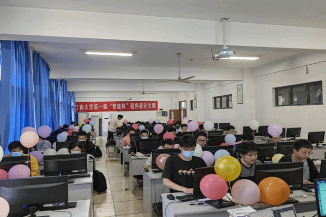 此次大赛于10月11日-14日发布大赛通知且开放报名通道,吸引了全校来自不同学院近300名同学报名参赛。大赛共分三个阶段:网络预选赛、热身赛及现场赛。经过网络预选赛后,有44名同学进入到最终的热身赛及现场赛。现场赛中每个题目对应一种颜色的气球,成功解答该题目的队伍会得到对应颜色气球。比赛现场竞争激烈,同学们争分夺秒,气球争相升起,经过长达5个小时的角逐,御宅屋