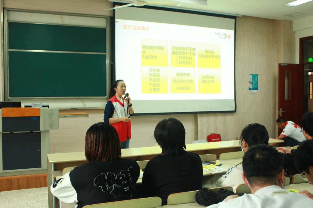 本次讲座,陶晓老师介绍了红十字会的工作内容、造血干细胞的捐献、突发性疾病的典型特征、紧急救护的注意事项、心肺复苏的操作流程等内容。她通过科普什么是造血干细胞以及通过造血干细胞移植可治疗的疾病,捐献条件以及捐献流程等知识,呼吁有意愿的同学参与造血干细胞的捐献。关于紧急救护,陶老师讲解了生活中常见突发事件(如触电、中暑、癫痫、创伤出血、骨折、烧烫伤等)的典型症状和相关急救知识,指出我们要把握住最佳抢救时间“黄金四分钟”,根据专业急救知识,在保护好自己的前提下开展紧急救护。