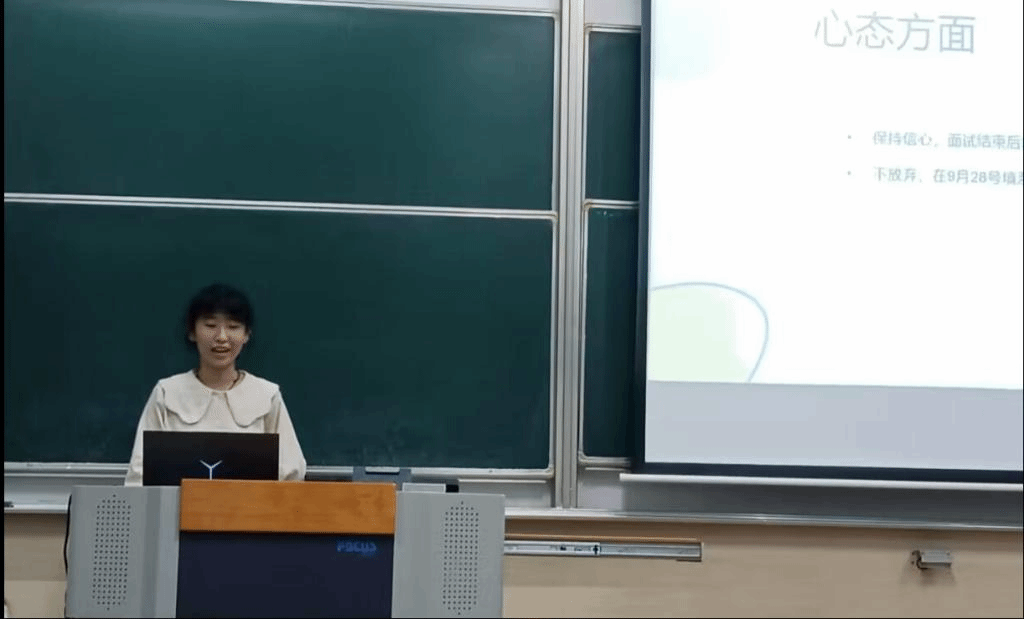 第二位是袁羽奕作分享,她成功保研至上海交通大学设计学院。袁羽奕是跨专业保研,她从为什么进行跨专业推免和判断自己是否适合跨专业保研两个方面和同学们进行了交流,同时她也分享了自己的求学经历以及在大学生涯中自己所取得的相关科研成绩。最后,她鼓励同学们要勇于尝试、在剩余的大学时光里努力提升自己。