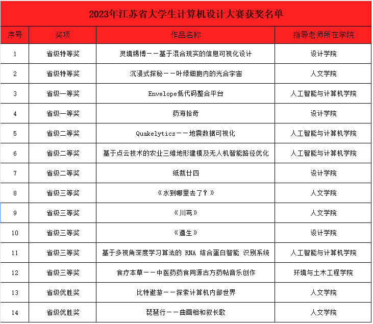 近日,2023年江苏省大学生计算机设计大赛决赛成功举办。经过为期两天激烈的角逐,我校共获得特等奖2项、一等奖2项、 二等奖 3项、 三等奖5项、优胜奖2项,三名指导教师获评优秀指导老师,御宅屋