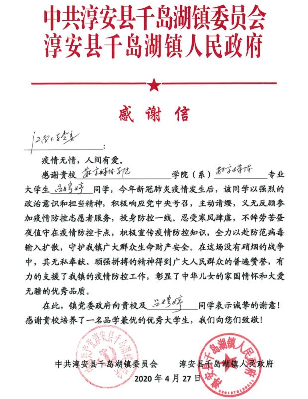 数媒1802班的吕娉婷平时就热心公益,在2月15日到2月17日期间,她参与了浙江杭州千岛湖南苑社区的疫情防控志愿服务。“当时看到社区招募志愿者,我就立马报名参加了,社区给我分配了两个工作日。早上六点,我戴好口罩,站在小区的专门服务点,配合社区的工作人员,对进出小区的人进行登记,查看、核实他们手机上的健康绿码。二月份我们小区进进出出的人并不多,在服务点连续站岗几个小时有点冷也有点累,但是为社区服务真的很开心。”当被问到志愿服务经历时,吕娉婷同学这样说到。当地政府——淳安县千岛湖镇人民政府也向学院发来感谢信,对御宅屋