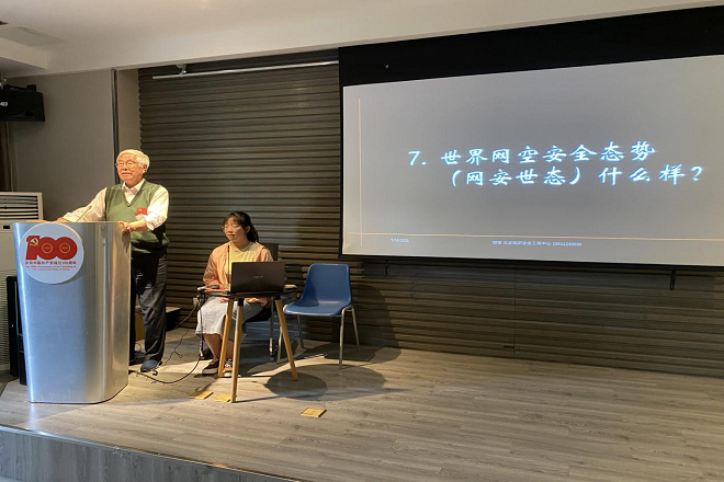 在116报告厅举办庆祝建党百年系列活动“青春心向党”党课第二讲“筑牢意识形态防线,守护网络安全”专题讲座,中国科学院大学教授/博士生导师、北京知识安全工程中心主任、中国科学院信息安全国家重点实验室教授吕述望应邀作题为:“人类活动的第五疆域——网空”的报告。学院党委副书记、副院长陈祎,副院长柴志雷,学生党员代表参加了讲座。会议由辅导员李猛主持。