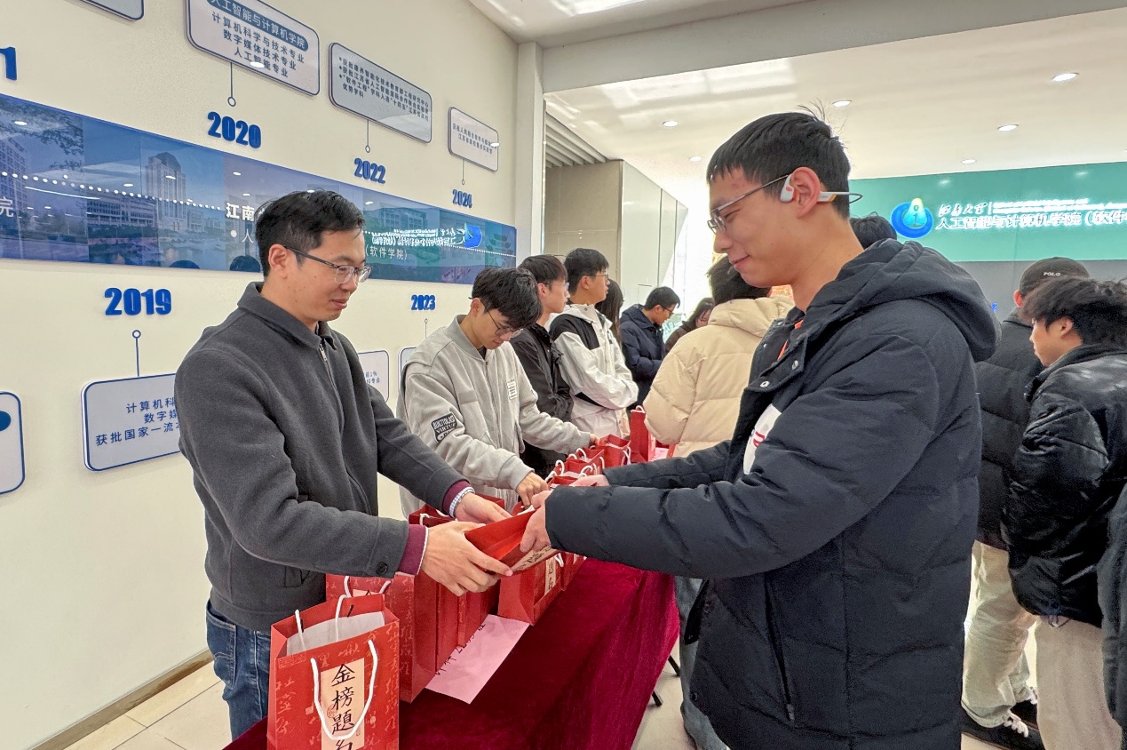 学院2025级研究生刘佳宇分享其备考冲刺期的心态调整及备考策略,祝愿大家都能为将近一年的努力画上圆满的句号。计科2203班副班主任、学院2024级研究生孙宇来到现场为同学们加油鼓劲,她坦言,最后一个月的备考期最难熬,但也最值得,希望大家坚持到底,山顶的风景绝不会辜负每一滴汗水。随后,毕业班班主任老师和班级班委为每一位同学送上“上岸礼包”。