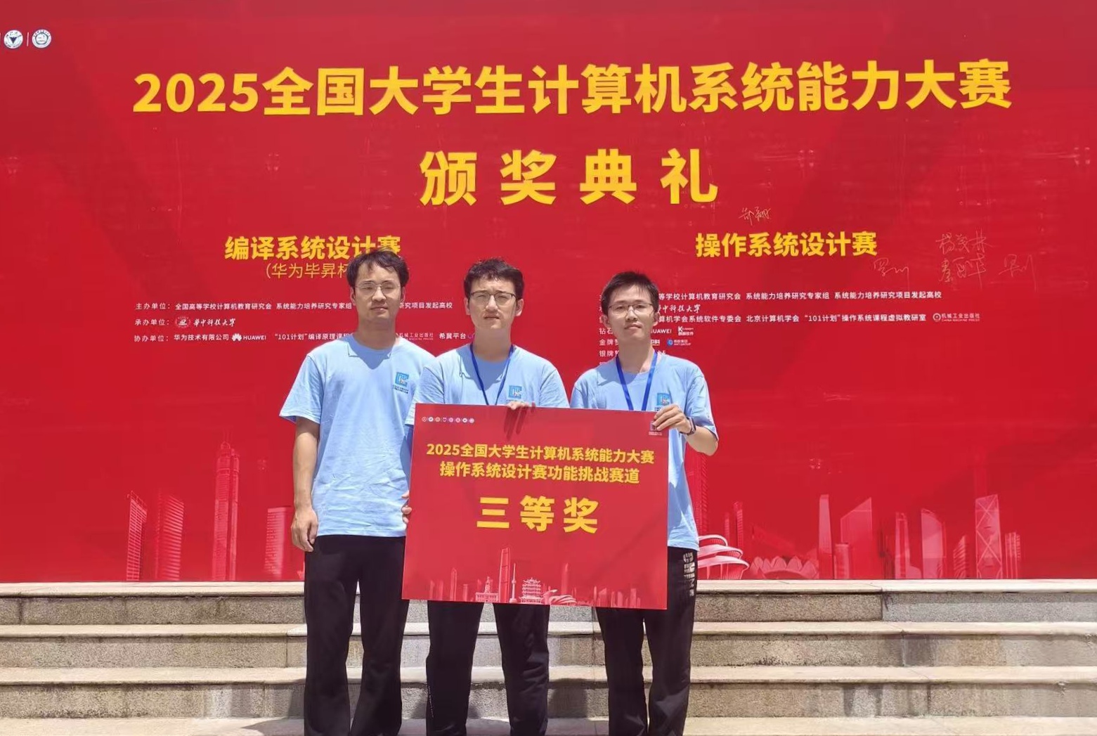 近日,2025全国大学生计算机系统能力大赛全国总决赛在华中科技大学举行。我院由方伟、周浩杰等担任指导老师的2支参赛队伍从清华大学、剑桥大学、北京大学等国内外顶尖高校的千余支队伍中脱颖而出,一举斩获编译系统挑战赛一等奖1项及操作系统功能挑战赛道三等奖1项,刷新我院在该项赛事中的历史最佳战绩。全国大学生计算机系统能力大赛是国内计算机领域极具影响力和权威性的赛事之一,着重考察大学生在计算机系统设计、开发与优化等方面的综合能力。在编译系统挑战赛中,CodeSize赛道的团队基于毕昇编译器,采用了BOLT、段节管理、压缩壳等技术,成功将代码体积平均降低了81.7%,远超去年的46.3%;并行优化赛道的团队扩展SysY语言,实现非规范循环结构向量化、并行块合并优化,并创新性利用AI驱动的自动化配置,实现指令级和线程级并行,显著提升程序性能。两支队伍均获得华为毕昇编译器架构师及编译器领域技术专家的高度评价。在操作系统功能挑战赛道中,参赛团队基于Linux内核模块编程技术,通过引入两级密钥架构、TPM密钥管理等创新性设计,实现了一个面向RISC-V架构的文件级安全文件系统,展示了团队在操作系统领域的深厚功底。